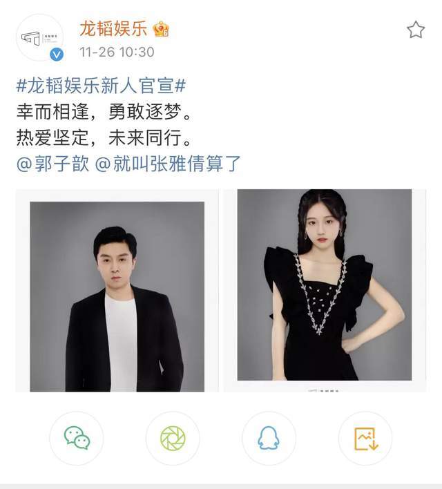 11月26日黄子韬公司龙韬娱乐官宣2位演员向新人:郭子歆、张雅倩。二人海报标签分别为:“多元人生的演绎者”、“掉落人间的小甜豆”,身份类型明显,一经官宣引发诸多关注。