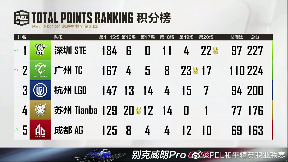前3个比赛日,STE每日吃鸡两次,以184分高居榜首,TC和LGD分别以167分和147分位列二三位。