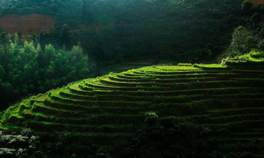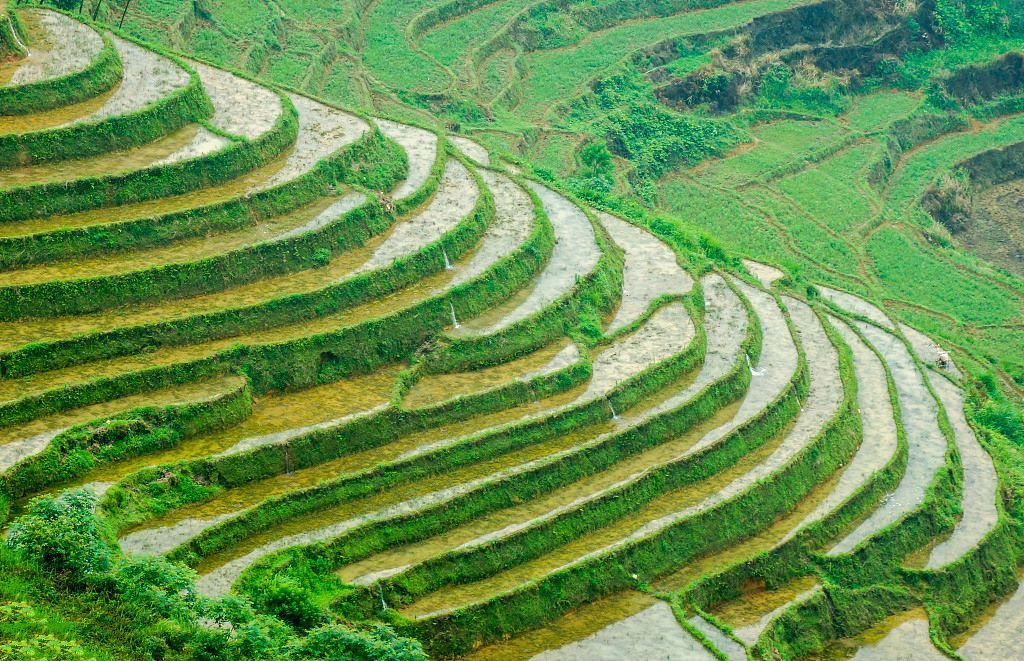 站在山上,脚下的山头布满了重重叠叠的梯田,一层层、一排排,次第铺陈在眼前。顺着山势蜿蜓起伏的田埂划出一条条优美的几何线,向远空延伸。在耕作期,山顶的泉水自上而下逐层灌溉,蓄满泉水的梯田宛如晶莹透亮的香槟塔。