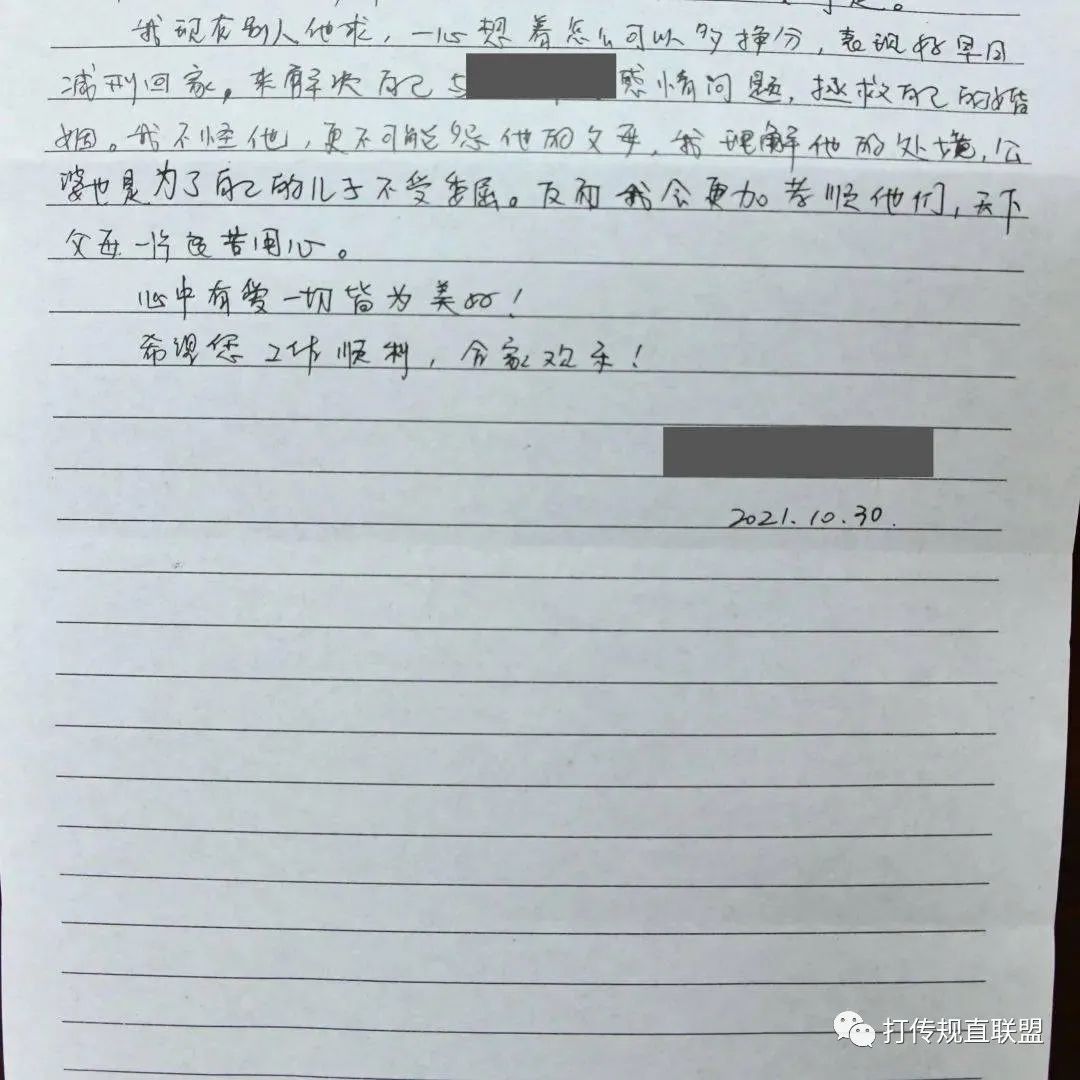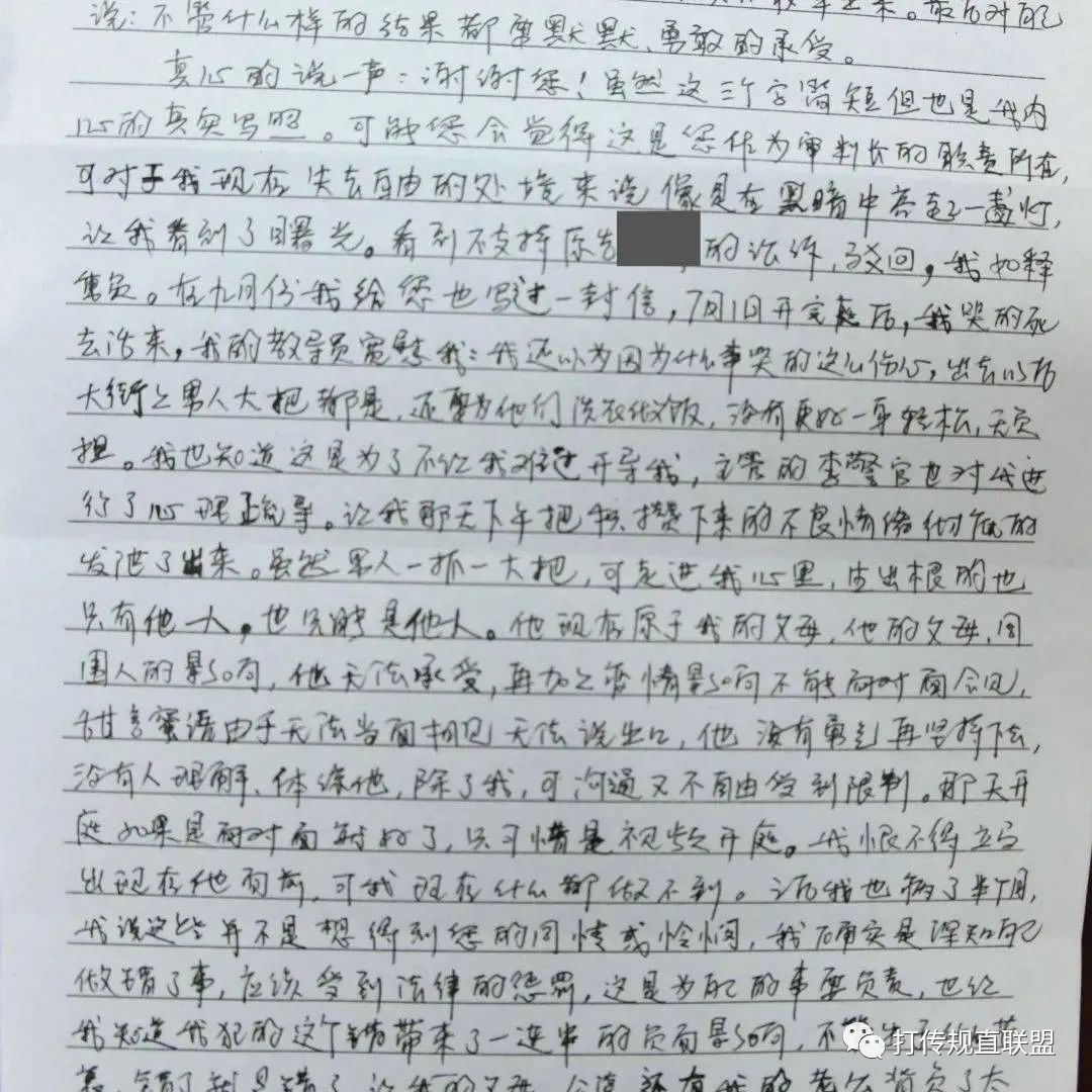 “彭法官您好,真心的说一声,谢谢您!虽然这三个字简短但也是我内心的真实写照。可能您会觉得这是您作为审判长的职责所在,可对于我现在失去自由的处境来说像是在黑暗中亮起一盏灯,让我看到了曙光。”当事人李女士在信中写道。