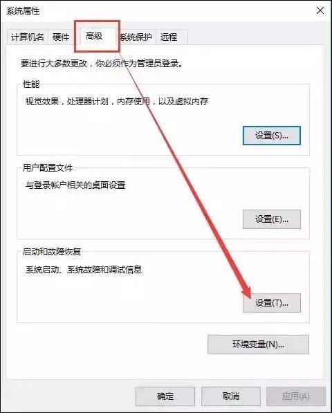 在“高级”中,点击“启动和故障恢复”下的“设置”。
