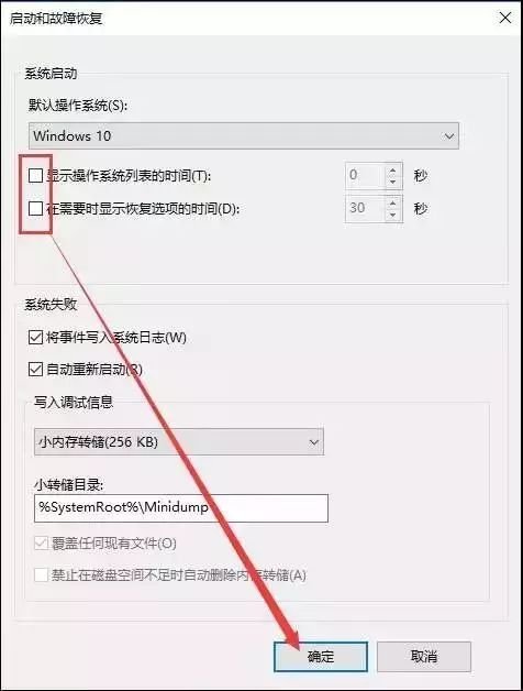 “系统启动”下,将“显示操作系统列表的时间”和“在需要时显示恢复选项的时间”前方框里的√去掉,确定。