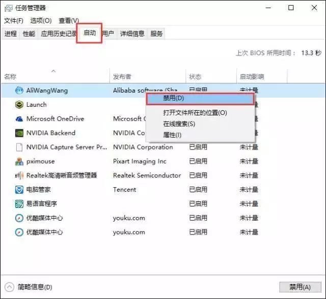 选择“启动”,右击无关的启动项,点“禁用”(通常除杀毒软件、系统驱动、管家类软件外,皆可禁用)。