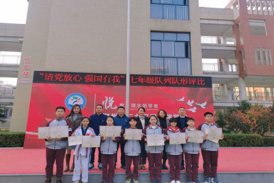台上一分钟,台下十年功。比赛通知一下发,七年级各班掀起了训练队列的高潮。体育课上,在体育老师的指挥下认真练习;课余时间,在班主任老师的陪伴下,勤加练习,不断进步。无论是班主任还是体育老师,都付出了大量心血,所有的同学都精神振奋,斗志昂扬,以极大的热情投入到训练当中,一声声口令,一句句叮咛,一次次进步,才有了今天的成果。此次比赛从精神面貌、服装要求、入场退场、体委表现、队列队形、班级特色展示等方面进行全面评分,最后评出一、二、三等奖、最具创意奖和最佳指挥奖。