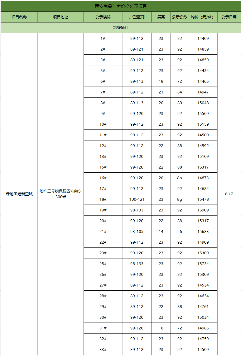 绿地集团西安兴港置业有限公司开发的“绿地丝路全球文化中心住宅DK1项目“3#幢商品住房,已取得《商品房预售许可证》(港务预售字第2021408号)共计92套,29日自行销售。意向登记购房家庭已在西安市商品住房购房意向登记平台登记、完成核验、公示,意向登记核验通过购房家庭共计72组,其中刚需家庭13组,普通家庭59组。