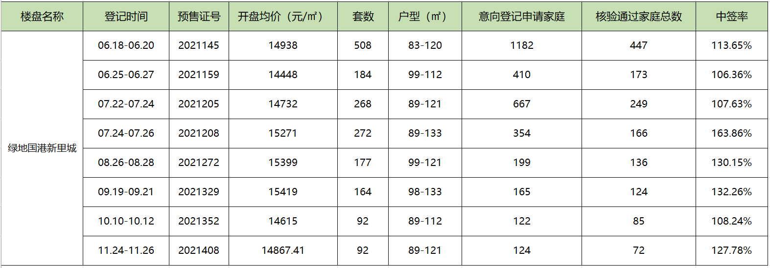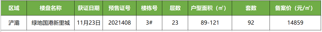 绿地国港新里城3#楼于6月17日进行了房价公示,并于11月23日取得预售证,预售证号为2021408。11月24日-11月26日进行线上登记,11月24日-11月27日进行资料核验。