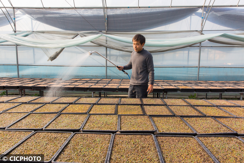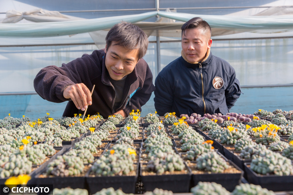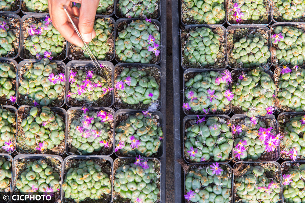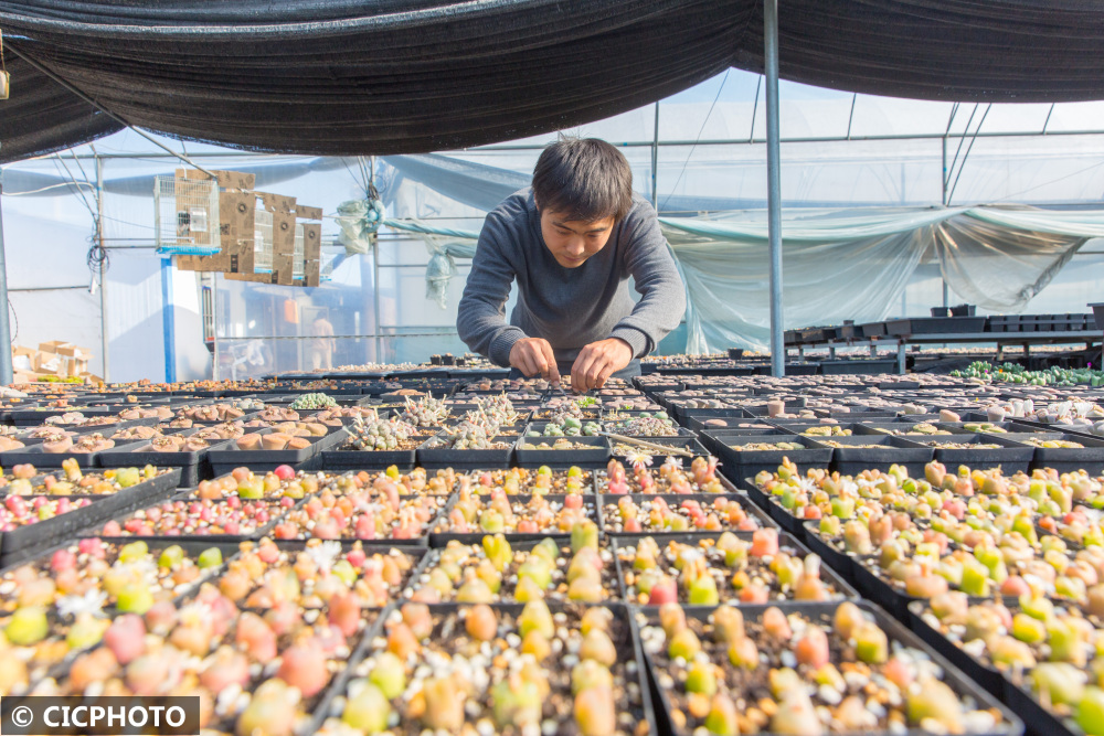 ↑2021年11月28日,在江苏省如皋市长江镇范刘社区一处园艺基地,邹杰瑞在管理生石花。CICPHOTO/徐慧 摄