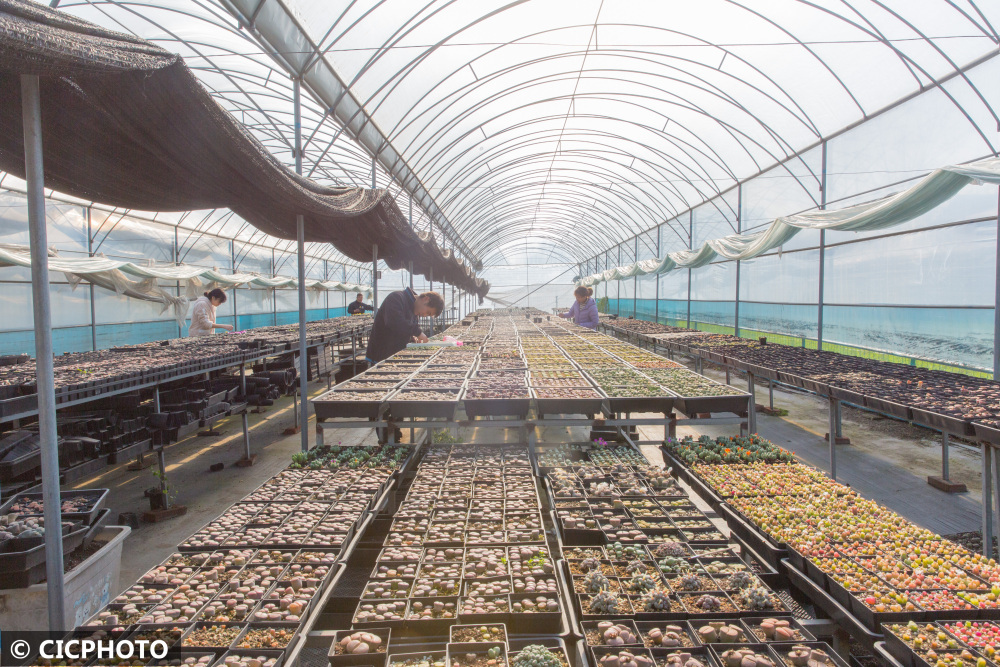 ↑2021年11月28日,在江苏省如皋市长江镇范刘社区一处园艺基地,邹杰瑞带领村民管理生石花。CICPHOTO/徐慧 摄