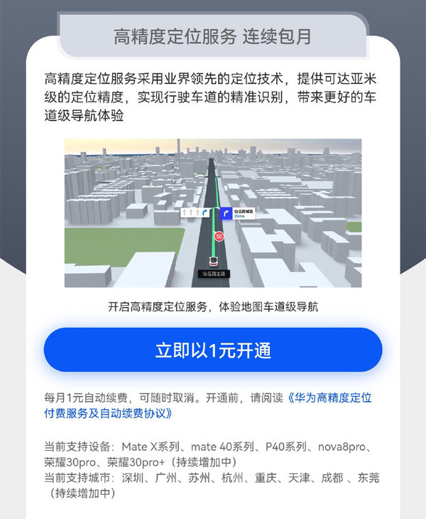 需要注意,这项服务不是1元就能永久享用,而是需要每月续费1元才能开通。同时,这项功能目前仅支持华为Mate X系列、Mate40系列、P40系列、nova 8 Pro、荣耀30 Pro/Pro+(持续增加中),而且用户仅在深圳、广州、苏州、杭州、重庆、天津、成都、东莞才能享受这一服务。