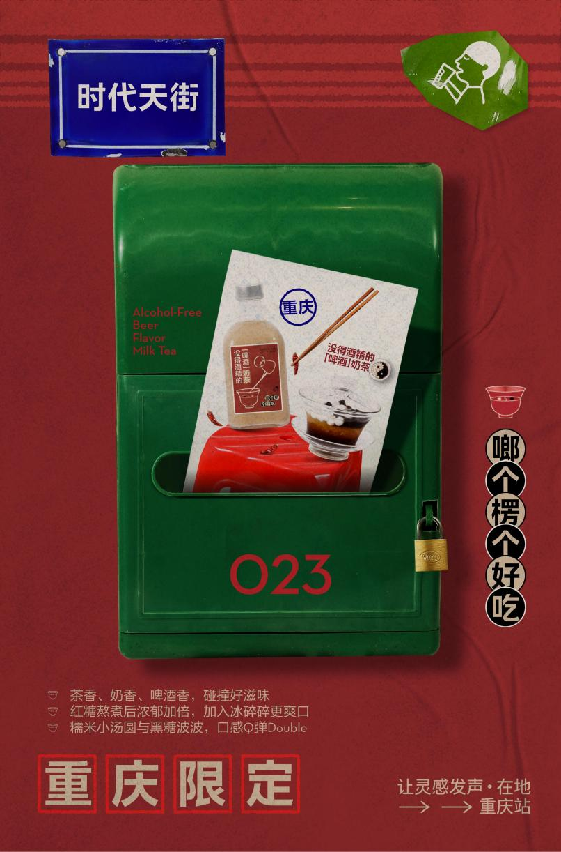 11月27日,喜茶在重庆时代天街店/北城天街店上新了城市限定新品-没得酒精的“啤酒”奶茶。本次城市限定新品,除了与本地饮食文化的集合,喜茶也将城市精神气质融入产品灵感之中。红豆冰沙小汤圆与啤酒都是经典的重庆火锅伴侣,喜茶选用无酒精的啤酒风味糖浆,与喜茶经典嫣红牛乳茶结合,打造出独一无二具有酒香风味的茶底,再配以红糖冰沙、糯米小汤圆、黑糖波波等底料,组成太极造型,放置于盖碗之中,让消费者体验到浓郁的重庆风味。品尝方式上,既可单独品尝冰沙波波汤圆与啤酒奶茶,也可以将奶茶倒入盖碗中,感受茶馆品茶之乐。