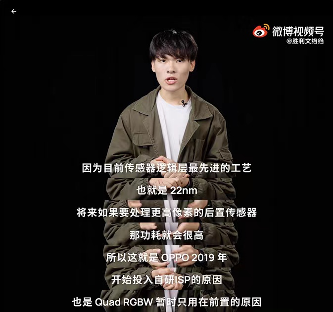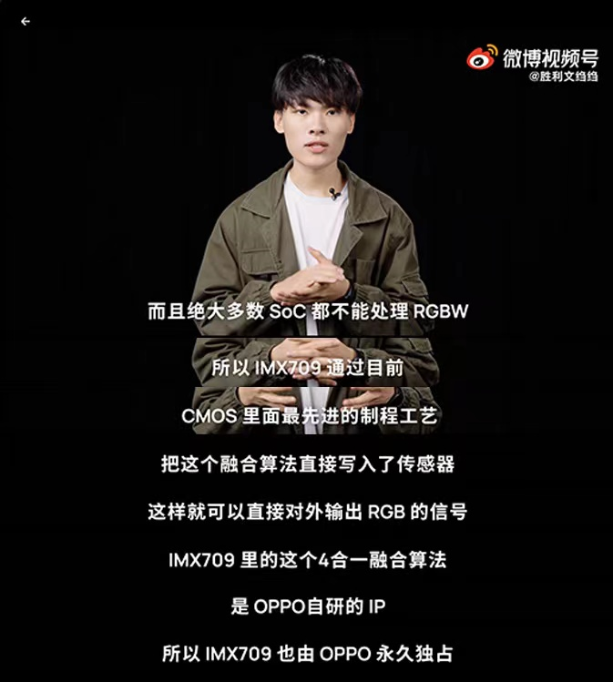 OPPO Reno7系列前置用的这颗IMX709,依靠CMOS里面最先进的制程工艺把RGBW算法写了进去,这样可以直接对外输出RGB信号,从而被SOC读取,因为多了白像素的识别,感光量能大幅提升。