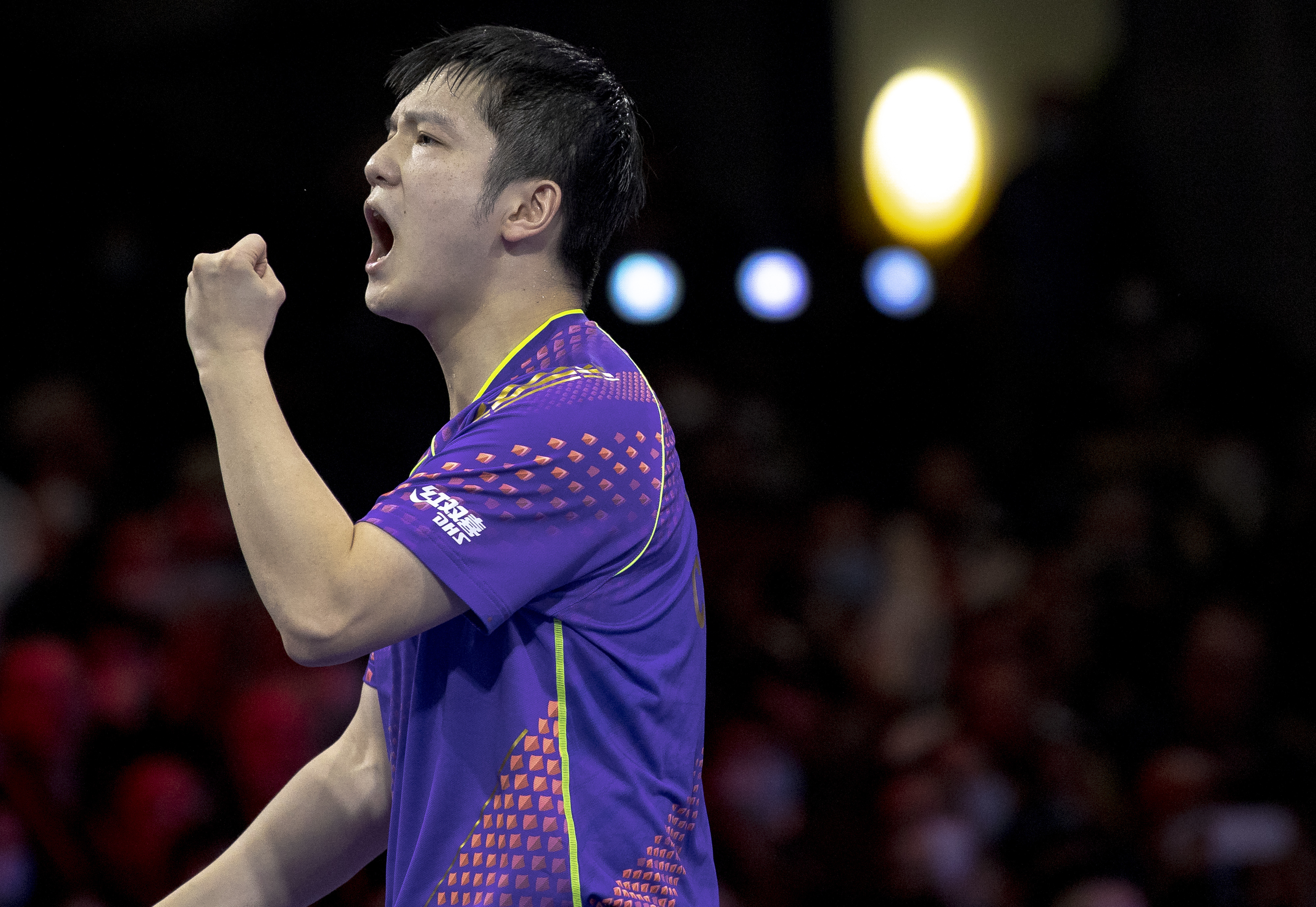 11月28日,樊振东在比赛中庆祝。新华社发(瓦格纳 摄)