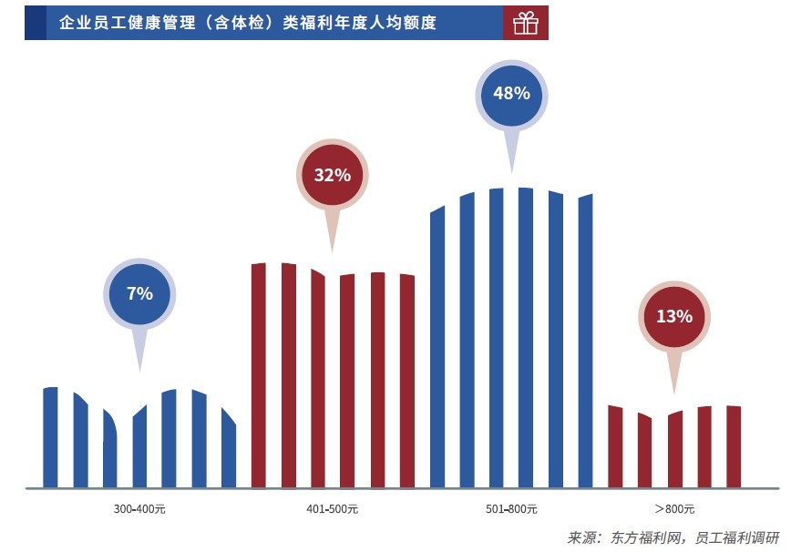 年度人均福利千元以内最普遍,福利预算分配基本趋同。在福利预算的分配上,传统佳节福利是企业员工福利的第一大福利,针对春节、端午、中秋三大传统佳节的人均福利预算也各不相同。此外,企业当前在员工健康管理(含体检)类福利投入年度人均额度较高,不仅年度员工健康管理类福利人均额度均高于300 元,且年度人均额度501-800 元的企业占比最多(48%)。