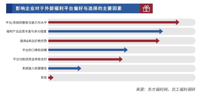 数据显示,企业在外部福利平台的选择方面更看重福利产品品类的多样性、考察服务价格和口碑的优劣,与此同时,福利平台系统的数智化能力与水平是影响企业对外部福利平台选择的最核心的决定性因素之一,且在此基础上,企业也希望福利平台能够定期分享相关福利案例、解读最新政策,并提供同行间的交流分享等增值服务。