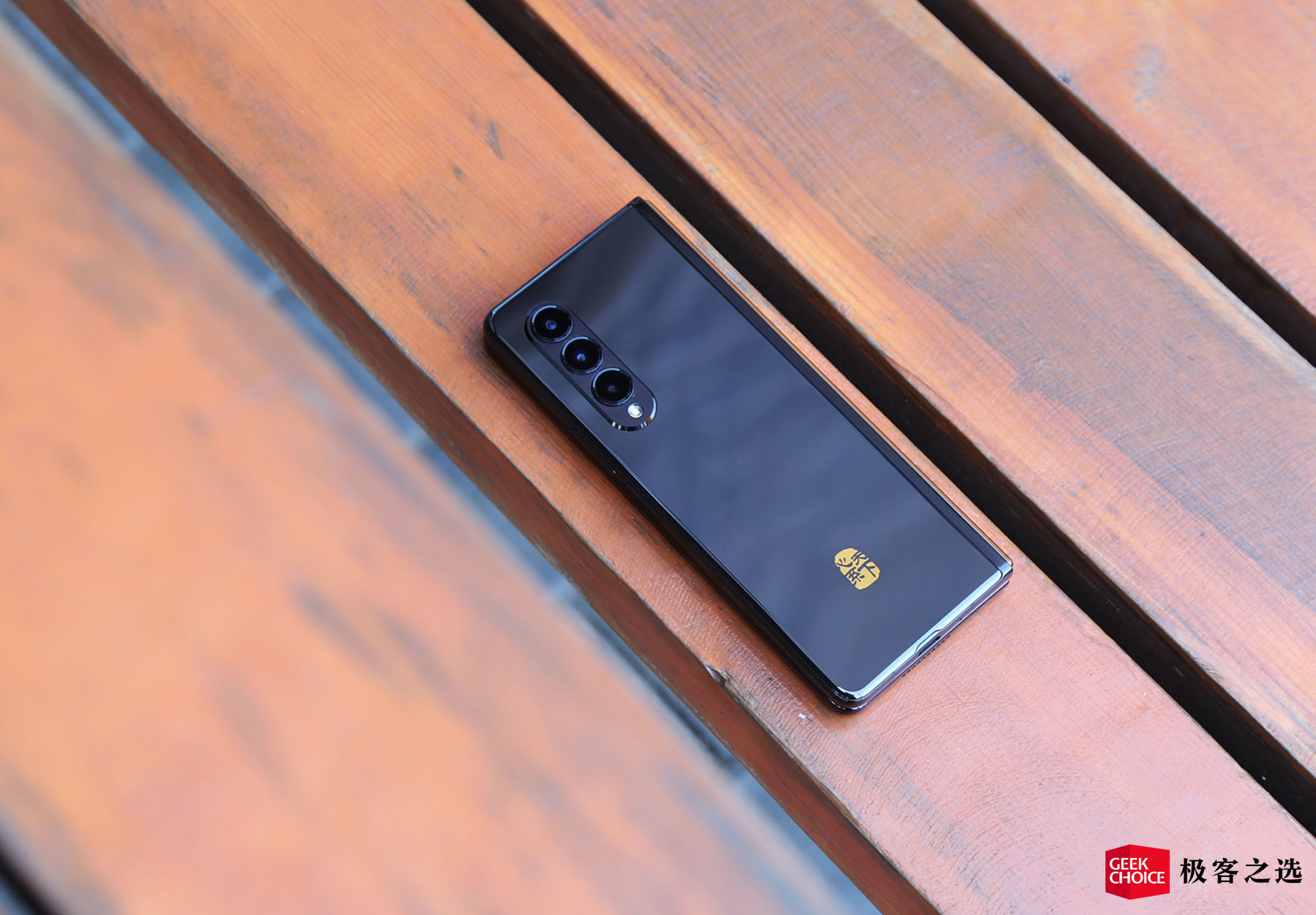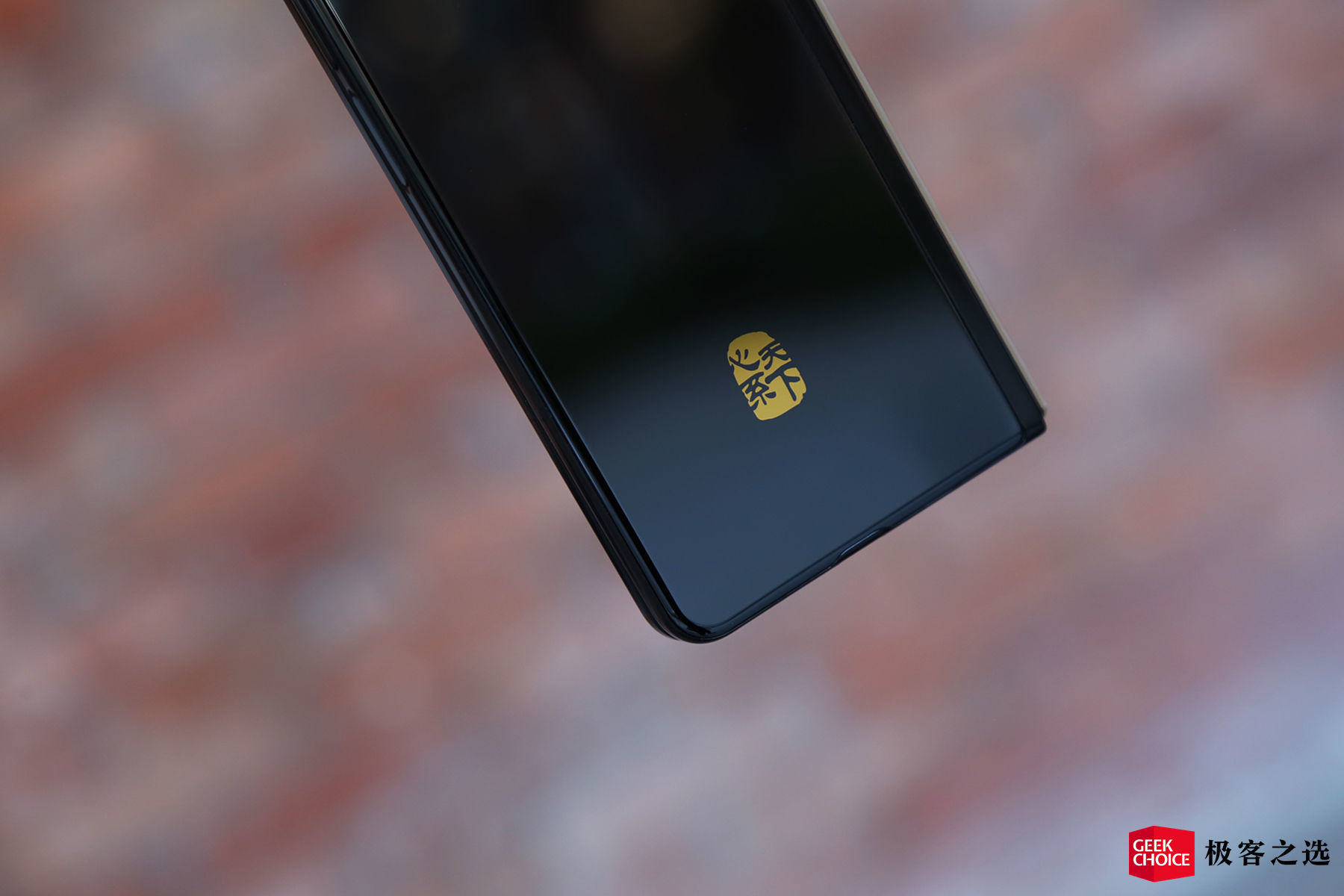 三星 W22 5G 只做了黑金(学名:雅瓷黑)一种配色版本。就像大家所看到的这样,机身整体为纯黑色涂装,后盖靠下位置则是金色中文「心系天下」字样,属于尊贵的 W 用户专属认证。当然通过这一点,你还可以很容易将其和三星 Galaxy Z Fold3 5G 进行区分。