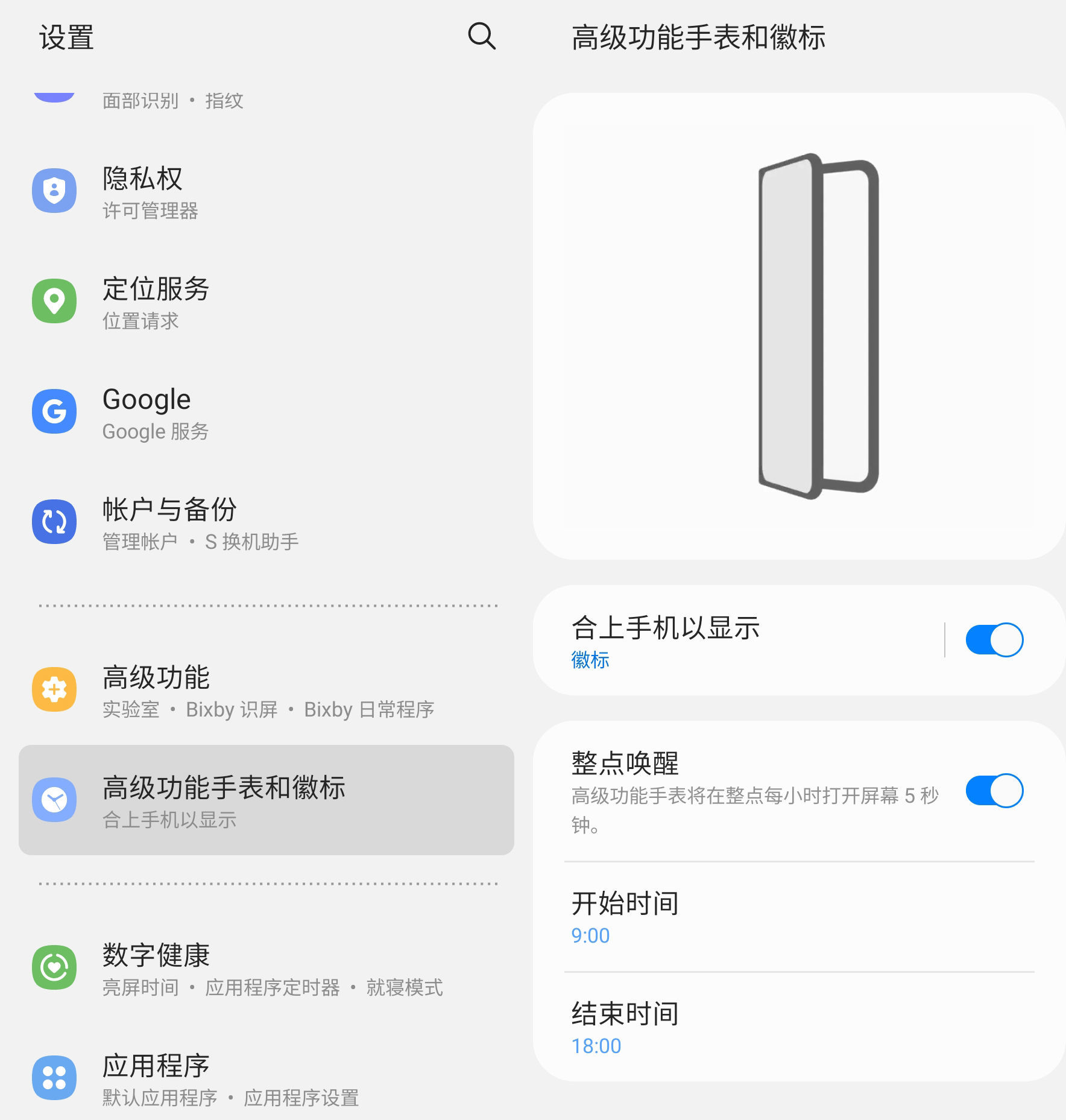 虽说自 W20 之后,心系天下系列的手机形态有所改变,但在展示手机高端感这件事情上,三星 W22 5G 完美继承了家族特有的一些功能设定。比如,你可以在高级功能手表和徽标设置选项中,自主设定合上屏幕时的外屏显示动画,满满的仪式感。