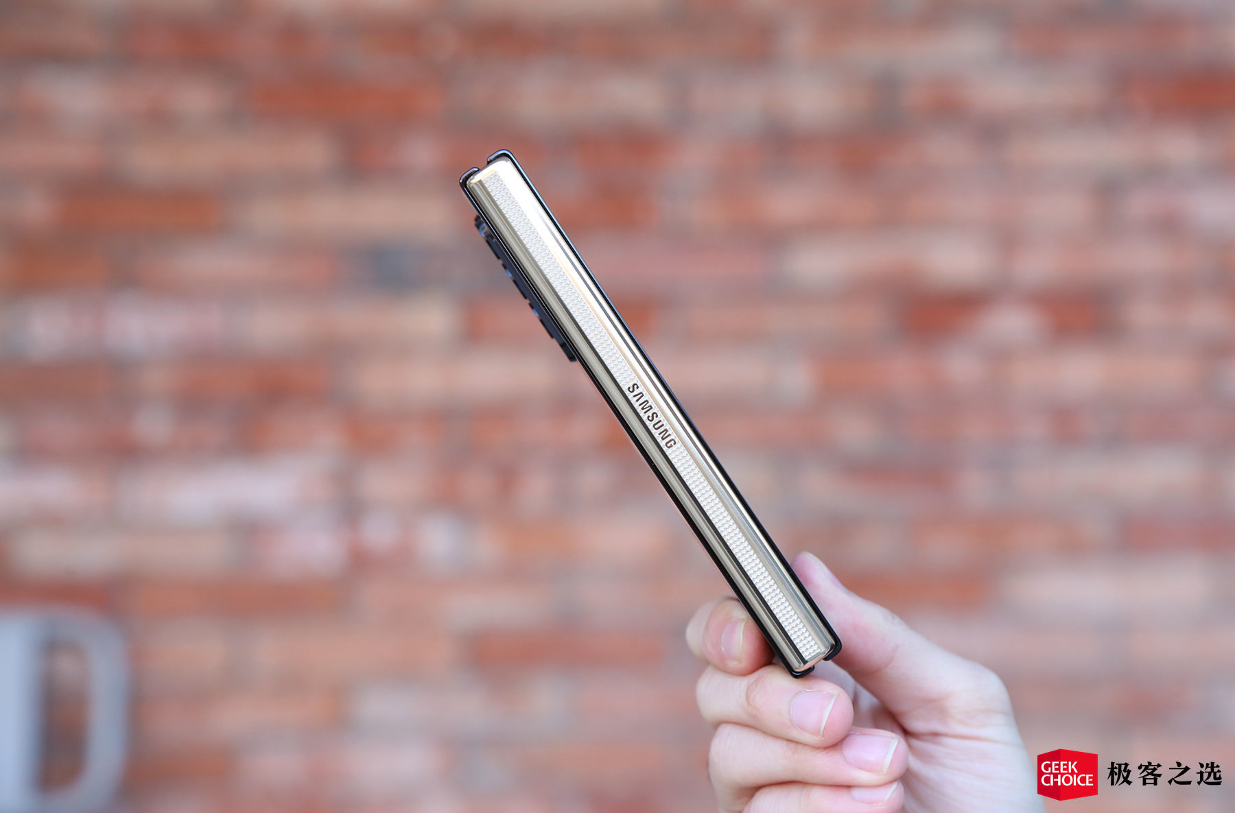 这款手机的设计精髓,是铰链盖板。三星为 W22 5G 的铰链盖板选择了金色配色,饱和度比后盖心系天下标识来的稍低一些,不会显得那么「腻」。表面则采用高端腕表的 PCD 金属精密切割工艺以及抛光处理,形成了规整的多切面圆形珍珠纹理。