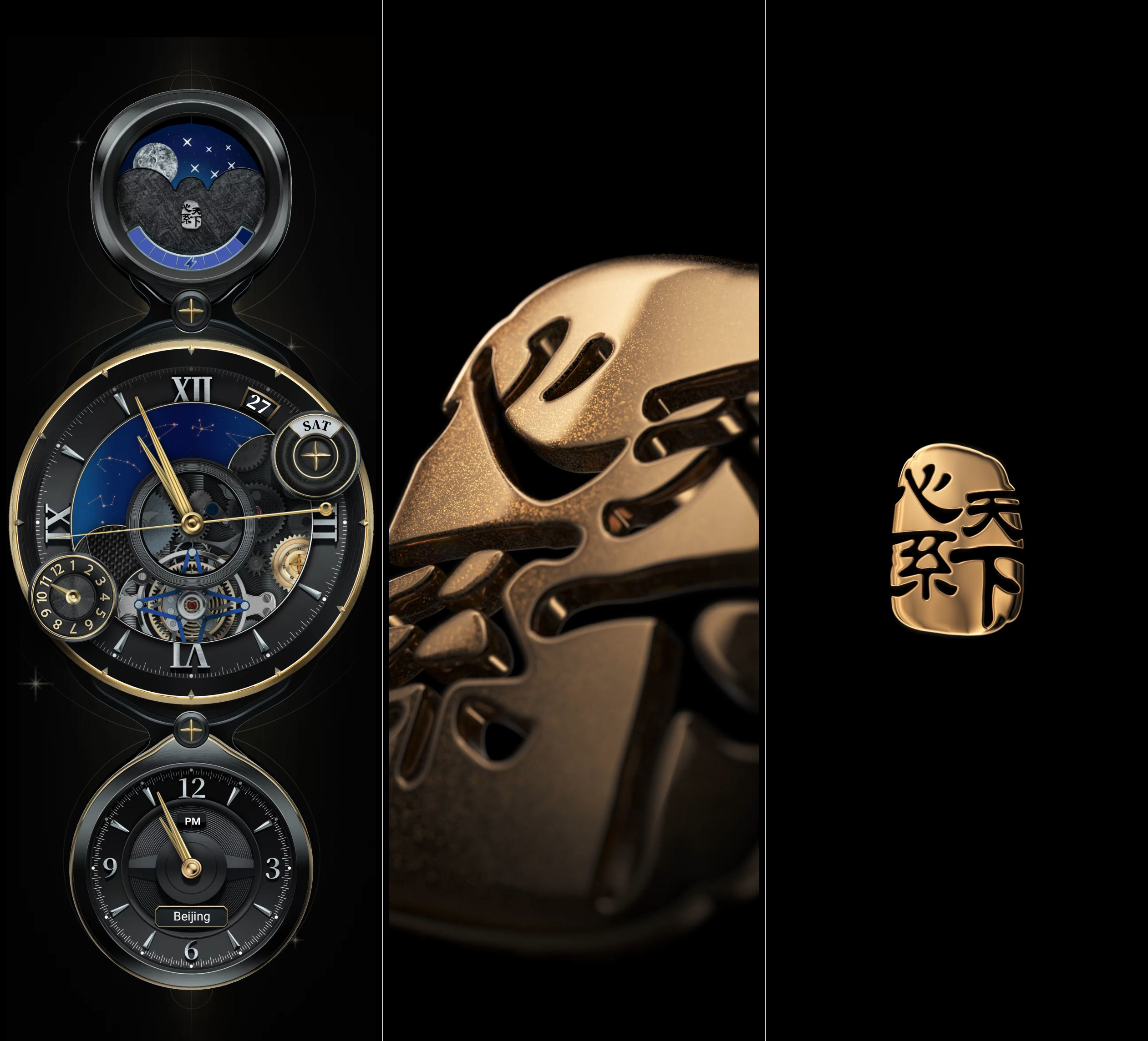 外屏动画有两种形式,一种就是大家非常熟悉的专属时钟,另外一种是「心系天下」动效 logo。这代产品的时钟是以经典陀飞轮式手表为灵感,同时融入了动态机械饰面、蓝色表盘以及金色指针设计。可能除了「贵气」,没有其它更合适的词汇来形容它所呈现出来的感觉。