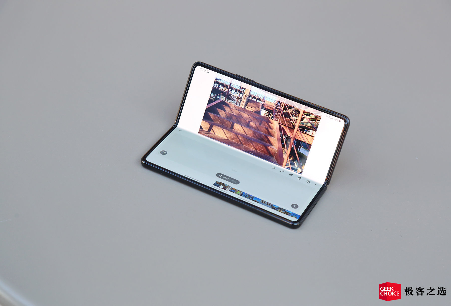 经过几代产品的经验积累,三星 W22 5G 的折叠屏应用生态建设也在稳步推进。比如,它的铰链支持多角度悬停,也因此具备立式交互模式。在这种模式下,手机会实现自适应分屏,屏幕会自动分成上下两部分,相当于只用一块屏幕就可以完成两块屏幕的某些工作。