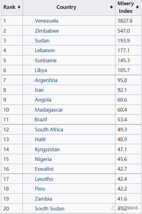 经济学家Arthur Okun提出:一个国家的民众,在经济上的痛苦程度,可以将失业率与通货膨胀率简单加和得出。这个指数被命名为痛苦指数(Misery Index)。自2013年以来,委内瑞拉一直都“雄踞榜首”,远超世界上其他国家,而在此之前,一直雄踞榜首的就是刚才提到的津巴布韦。
