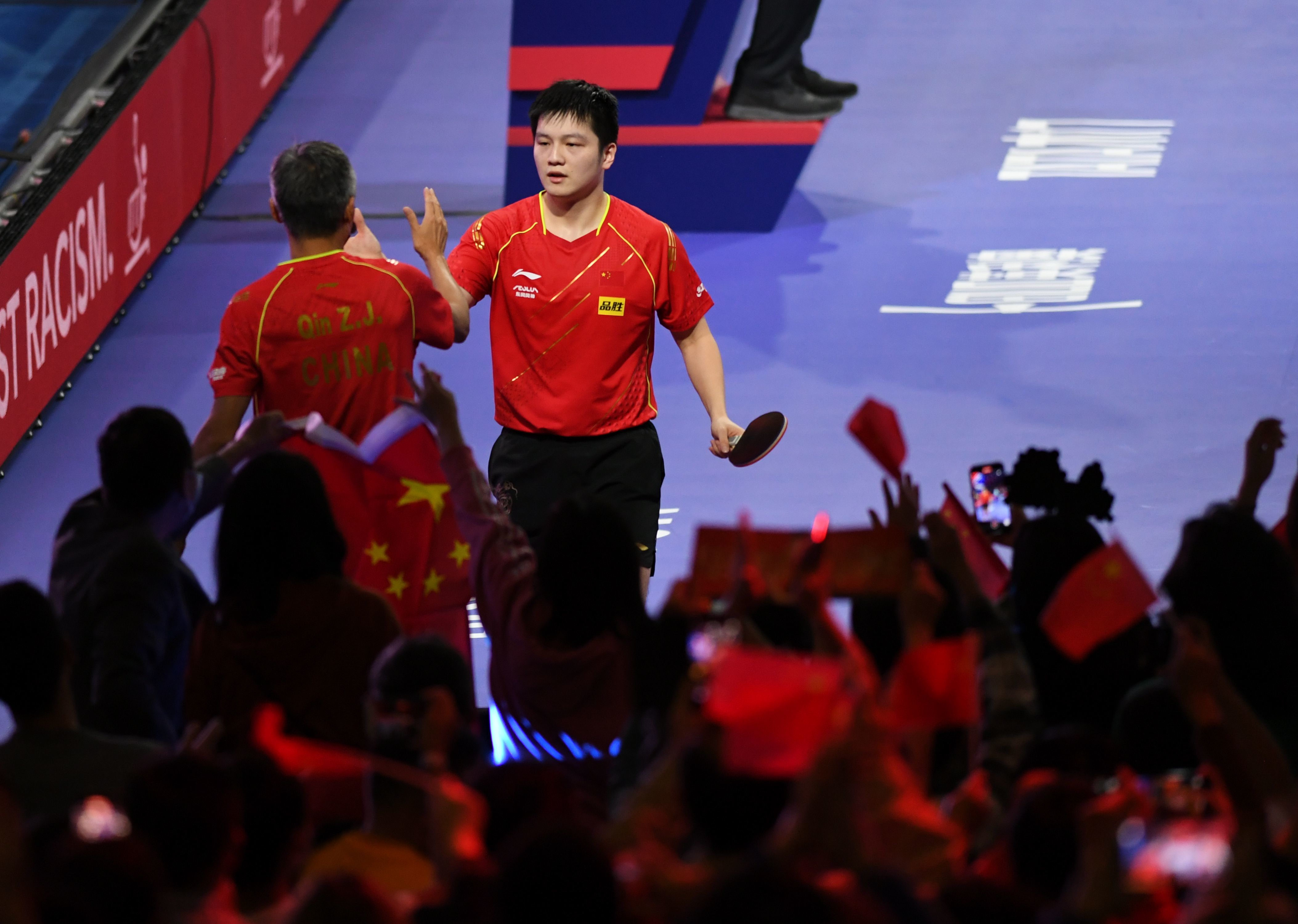 11月29日,樊振东(右)夺冠后接受教练秦志戬的祝贺。新华社记者 吴晓凌 摄