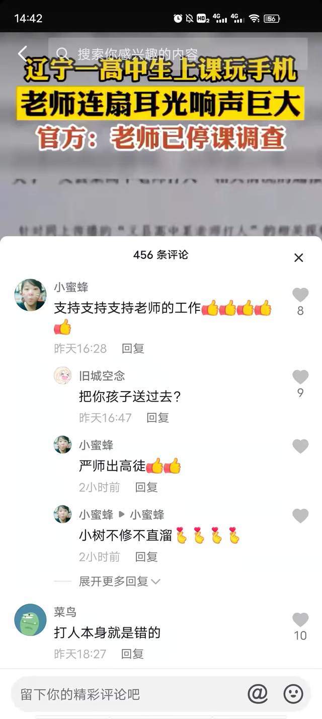 此视频下方的评论网友众说纷纭,看法各不相同。有网友说我们理解对学生要求严格,但是打人不打脸,高中生正值的想法新奇的年纪,不应该当着全班同学的面训斥,让其折损了面子,而且当众打脸的行为实在算不上一个妥善的解决办法。也有看法不同的网友表示,老师本就辛苦不易,学生上课玩手机太不尊重老师,理应受罚,视频被发布,老师很可能丢掉工作,为这种学生操心不值得。两种看法都存在一些极端之处,扇巴掌不是处理事情的最好办法,老师和学生的沟通绝不是打骂。我们当然理解老师的辛苦,在课上走神也是对老师的劳动成果的不尊重。知错能改善莫大焉,该学生一直在向老师道歉,在被打后也一直在认错,其态度没有问题。上课玩手机当时是不正确的,但老师的处理方式未免太过极端。学生和老师并不是两个不可调节的矛盾体,相互尊敬才能友好相处,我们可以看出该学生一直在认错道歉,态度诚恳,但是该老师一直不原谅,甚至动手打学生的脸。