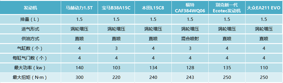 这五款发动机均采用了各自品牌最新的技术,性能表现都十分出色。咱们一一对比,看看马赫动力1.5T发动机是否名副其实。