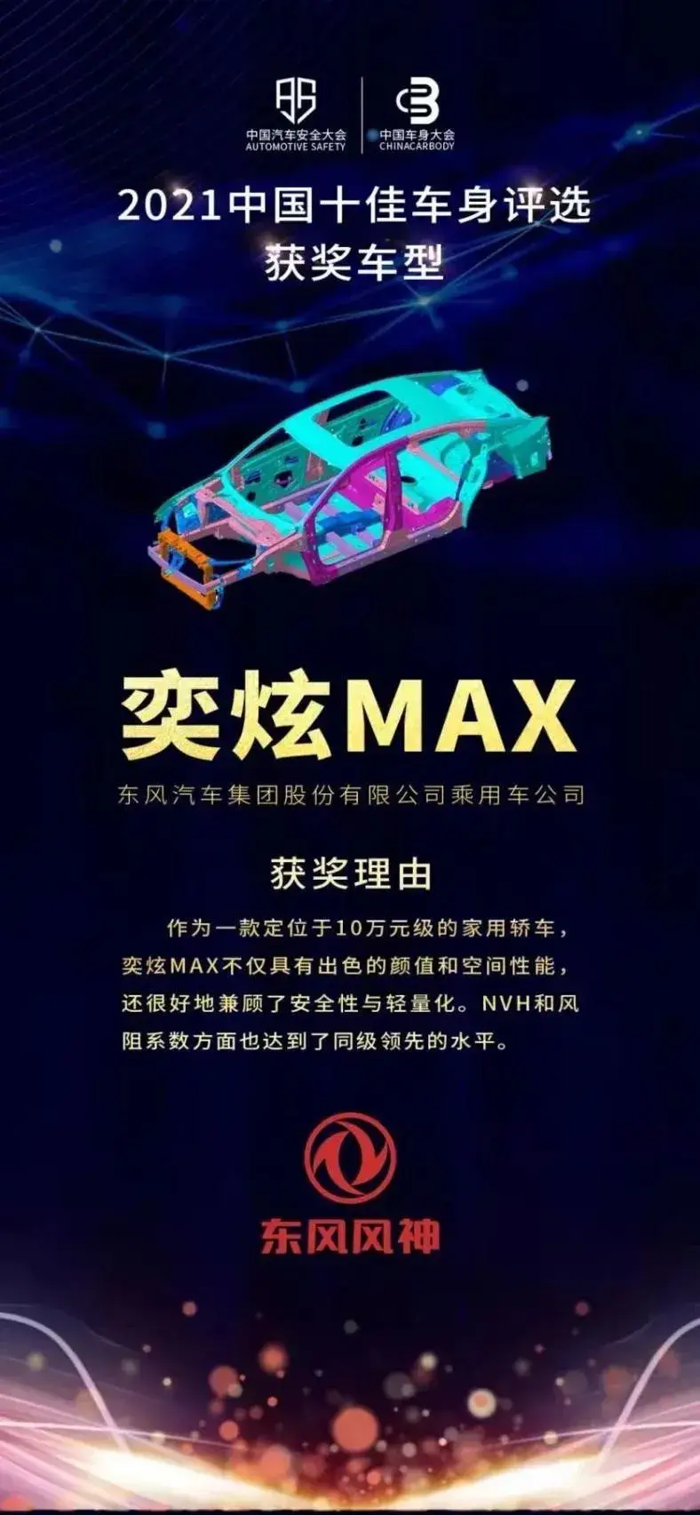 在如此扎实的表现之下,奕炫MAX自然也获得了不少奖项的肯定,在10月27日,2021中国汽车安全大会暨中国车身大会上,东风风神奕炫MAX,以优异的综合成绩,从39款热门新车中脱颖而出,成功进入到评选环节并最终荣获了“2021中国十佳车身”大奖。