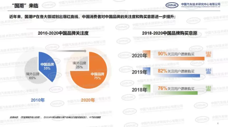 以中汽中心的调查数据为例,中国品牌关注用户的购买意愿,从2018年到2020年短短3年间,数据从76%上涨到了90%。