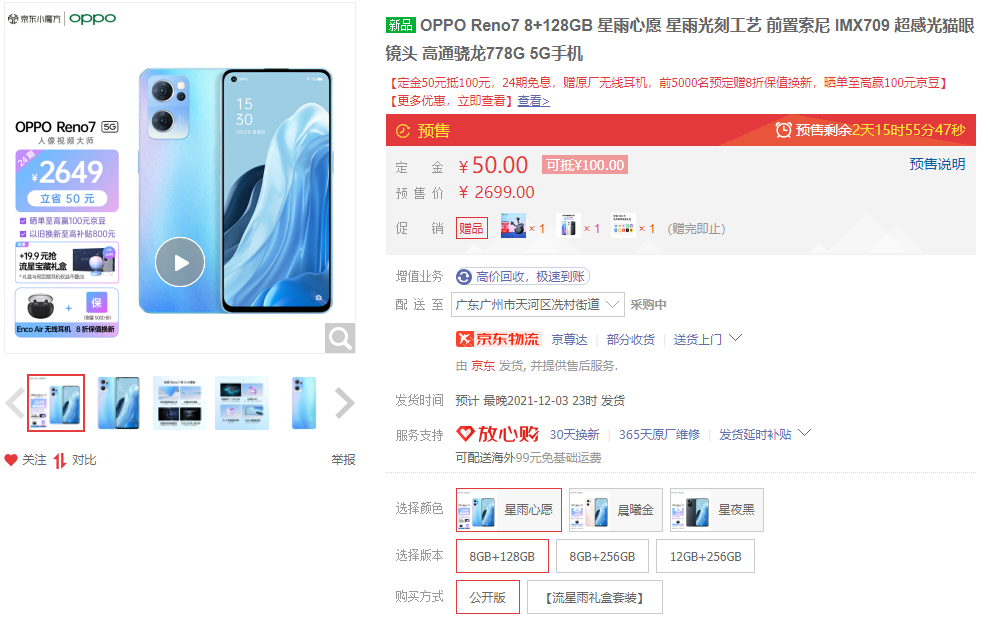 通过对比,不难看出OPPO Reno7从外观设计到机身工艺和性能配置都有升级,前置影像的提升感知也很明显。Reno系列的老用户可以放心升级新款。OPPO Reno7跟Reno7 Pro将于12月3日正式开启首销,目前预订可享受定金50抵100、赠送价值299的真无线耳机的福利,加19.9限量抢价值699元流星宝藏礼盒,感兴趣的小伙伴不妨关注了解。