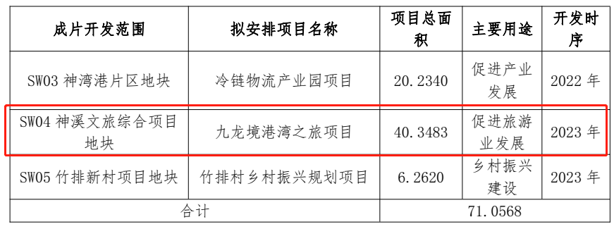 但方案中,没有对“九龙境港湾之旅项目”项目有过多的介绍,知道该项目位于神溪村,预计开发时序为2023年,总面积为40.3483公顷。