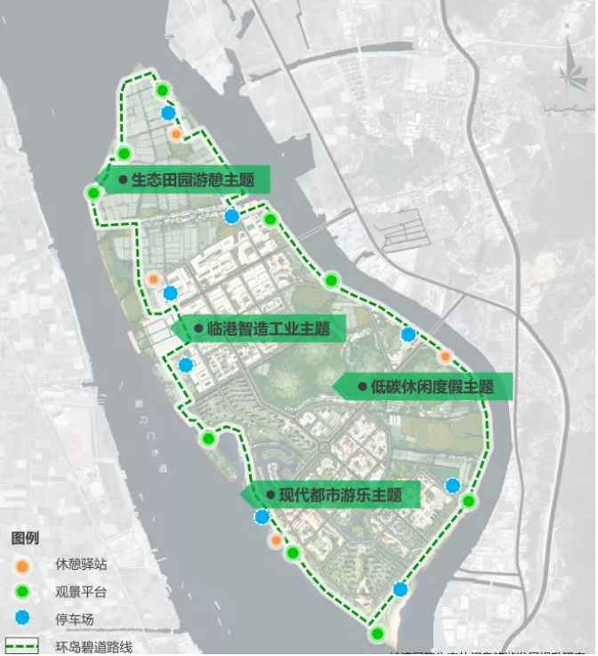 《提升研究》初步规划了总长约17.2km的环岛碧道路线,并将其划分为4个主题路段。在发展时序上,《提升研究》指出,近期先建立高端休闲、生态康养、主题游乐、临港经济的城市形象,初步建成湾区生态低碳休闲岛。