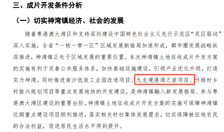 文中重点提及到,“打造实力神湾。同时推进南沙低效工业园改造项目、九龙境港湾之旅项目、竹排村乡村振兴规划项目等重点发展地块的开发建设,是神湾镇融入新发展格局、参与粤港澳大湾区建设的重要台阶”。
