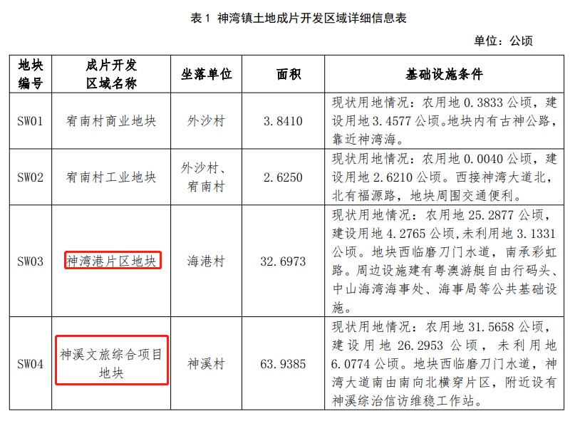征收成片开发方案以神湾镇中南部为主,包含 SW01 宥南村商业地块、SW02 宥南村工业地块、SW03 神湾港片区地块、SW04 神溪文旅综合项目地块、SW05 竹排新村项目地块,用地总面积 113.4154公顷。