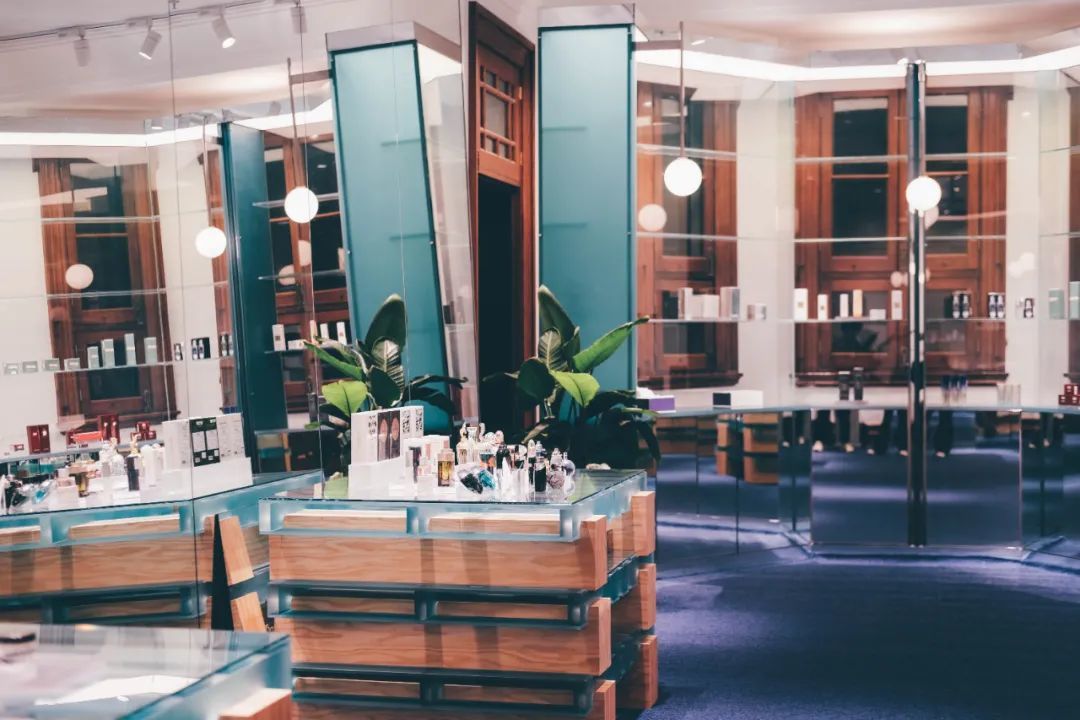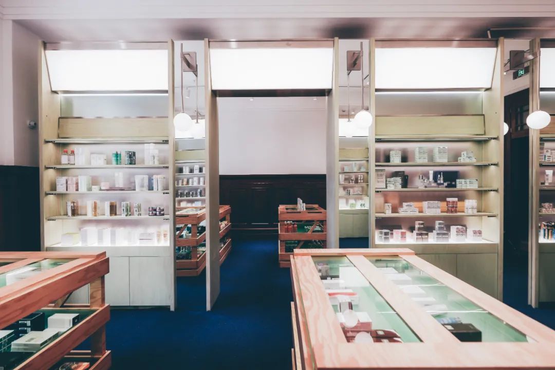 B:二楼的绿色,对 “可持续”这个概念有更准确的表达。比如 (纯净护肤)clean beauty、(有机)organic 一类的小众品牌是我们选品的重点。再来便是我们还衍生出了一个“自然研究机构”概念,可以看到这些大背柜其实很像图书馆或是实验室里的柜子。岛台也像是做实验的桌子。