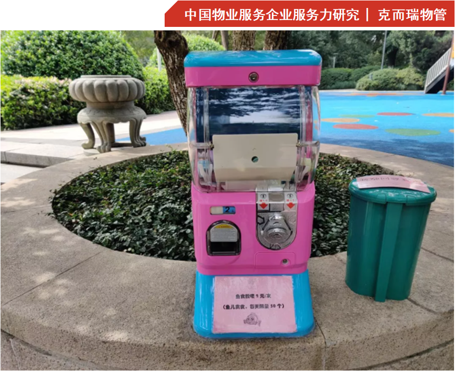 针对水池景观的维护,南都物业将水池中易潮的木质景观全部翻新,在水池内投放大量观赏用鱼,定期打理,同时别出心裁地设放鱼食扭蛋机,每日定量投放鱼食,使业主能够近距离地与环境生态进行互动。