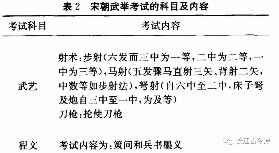 宋代武举在考试内容上,保留了唐代武举的骑射和马上武艺,并增加了刀、枪等兵器比试。规定武举不能只有武力 ,还要考查军事策略,诸如孙子兵法、吴子兵法及三韬六略等。提出了“以策对为去留,以弓马为高下”的考核标准,策略优秀、武艺平平的可评为中上,武艺优秀、策略平平的只能评为中等。