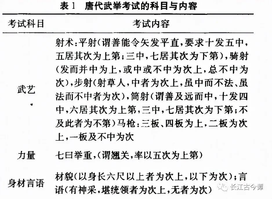 唐朝武举偏重于武艺,马枪、马射、步射、筒射、长垛、翘关(举重)和负重都是考查的内容,此外还要看身材、言语。