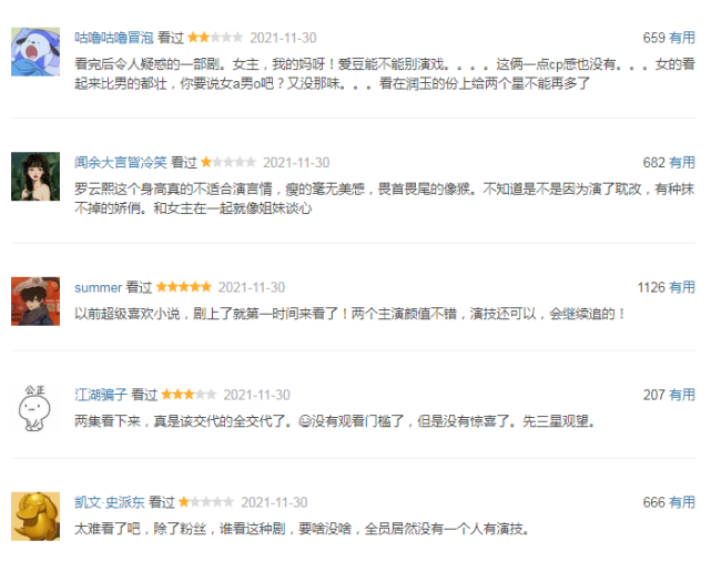 这部《良言写意》上线之后,因为男女主角自带热度,再加上不少喜爱都市言情剧的观众加持,让《良言写意》的讨论度稳步上升,但是打开豆瓣评论却发现,除了一些花式夸主角的影评之外,几乎有一半短评都在吐槽剧情狗血、男女主CP感不足。