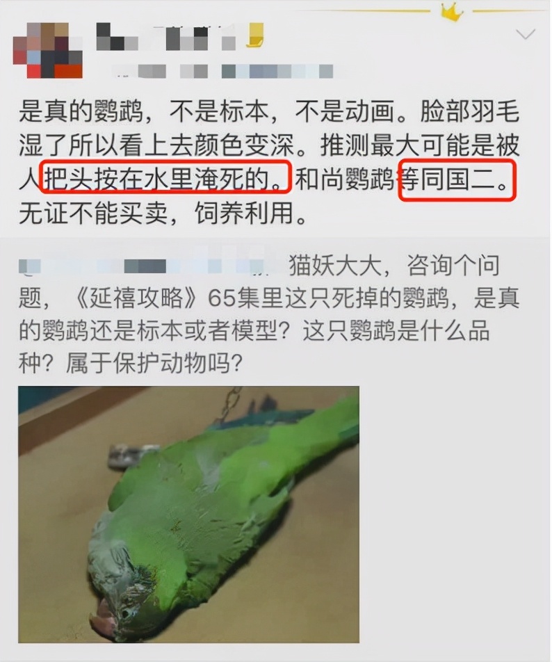 随着事情和该类话题的发酵,越来越多的影视剧组被网友们质疑存在虐待动物的行为。比如,在《延禧攻略》中,画面出现了摔鹦鹉笼的镜头,而后有科普博主指出鹦鹉为国家保护动物,并且死状看起来像是被淹死的。