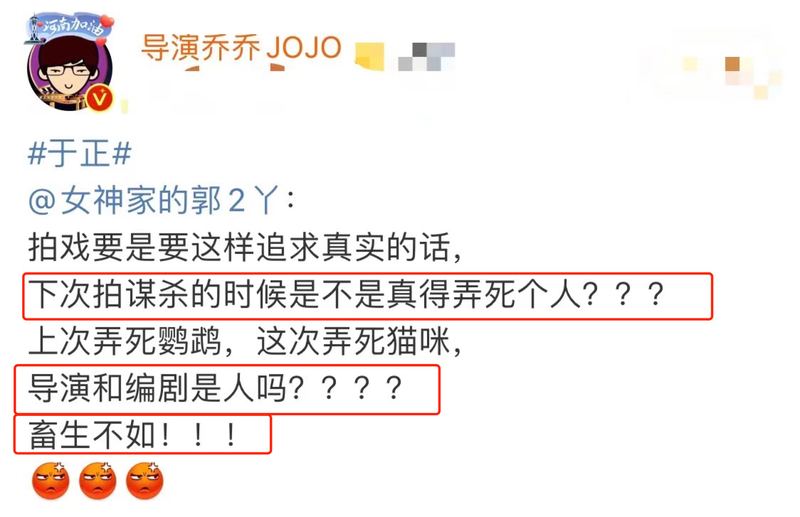 一名为“导演乔乔JOJO”的博主在自己的社交平台上发表了一个帖子,在上面该博主愤怒地表示到“下次拍谋杀到时候是不是真的弄死个人”,“导演和编剧是人吗”以及“畜生不如”。