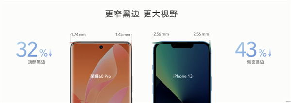 官方数据显示,荣耀60 Pro的顶部黑边比iPhone 13窄了32%、侧面黑边窄了43%,通过更窄黑边做到了更大视野。