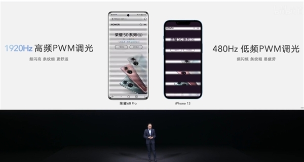 荣耀60 Pro采用1920Hz高频PWM调光,频闪高、条纹细、更舒适。iPhone 13则是480Hz低频PWM调光,频闪低、条纹粗、易疲劳。