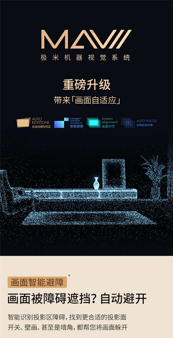 此外,NEW Z6X还有一个超强的功能,那就是与旗舰机型极米H3S相同的,自动避障和幕布对齐功能。这项功能在车内倒用不上,但如果你想拿回家中使用,那就非常方便了。举个例子,当墙上有插座或者挂画等障碍物,极米New Z6X会自动识别并且调整画面,避开这些障碍物进行投射。从而避免了每次都需要手动调整机器位置,或者手动对画面进行梯形校正来避开障碍物。提升了日常使用的便利性的同时,也避免手动调整的误差。
