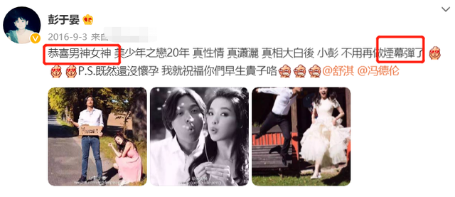 2016年,舒淇和冯德伦结婚,彭于晏为她送上了结婚的祝福,还调侃自己再也不用做“烟雾弹”了。后来,两人在明面上的互动逐渐减少。