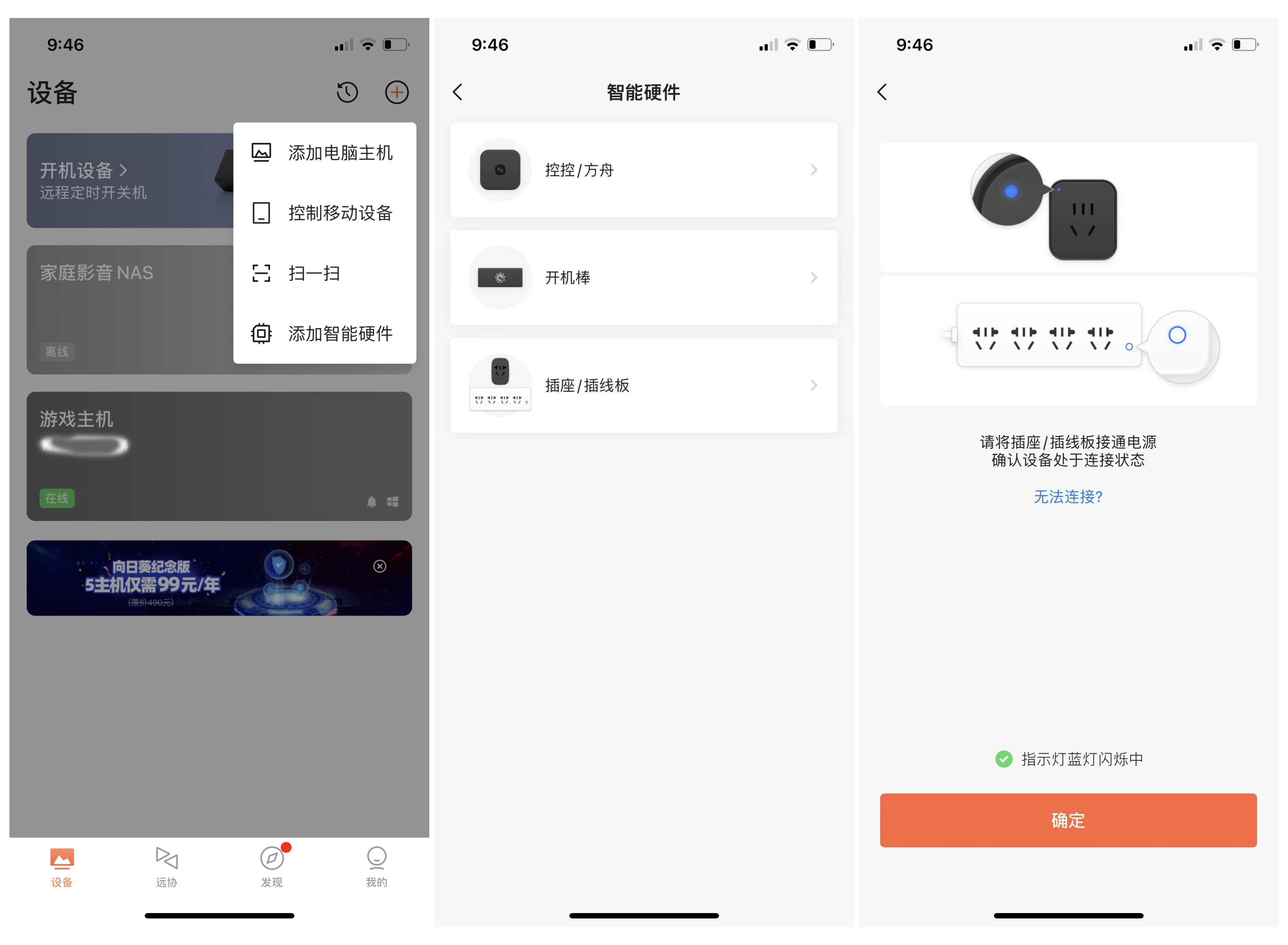 在向日葵APP里添加智能硬件,选择插座/插线版,向日葵开机插座C2(计电量版)插上通电进行绑定。