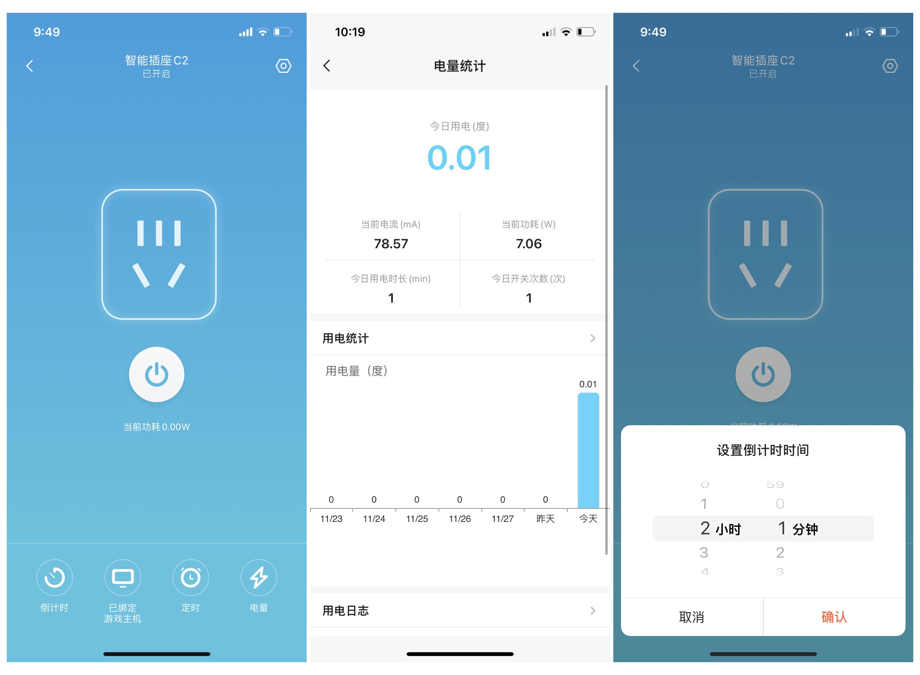 其中,基本功能有电量计量功能,可以实时查看插座连接设备的耗电情况,也拥有用电日志记录每天的用电情况。另外还有定时和倒计时功能,可以精确到分钟来控制设备的开关机和使用时长。