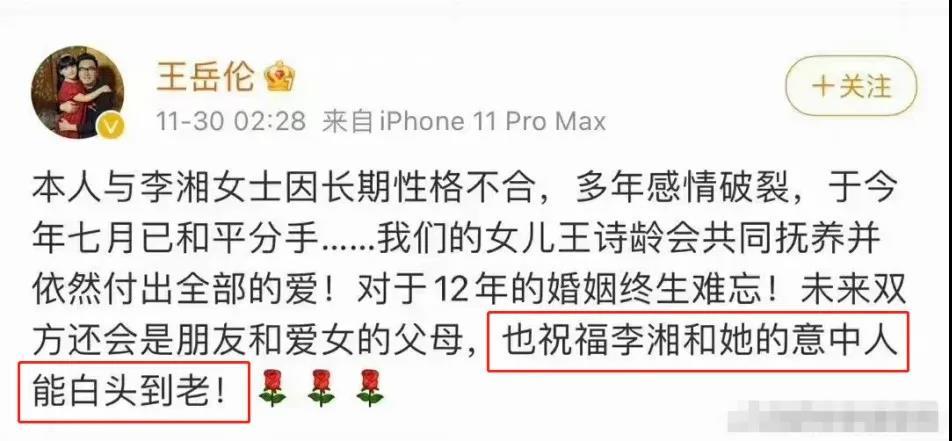 第n次被拍到出轨的王岳伦凌晨发微博又删除,开头生硬冷漠地称李湘为李湘女士,说离婚原因满屏修饰词:长期性格不合、多年感情破裂、对于12年的婚姻终生难忘。结尾还阴阳怪气意有所指:祝福李湘和她的意中人能白头到老。