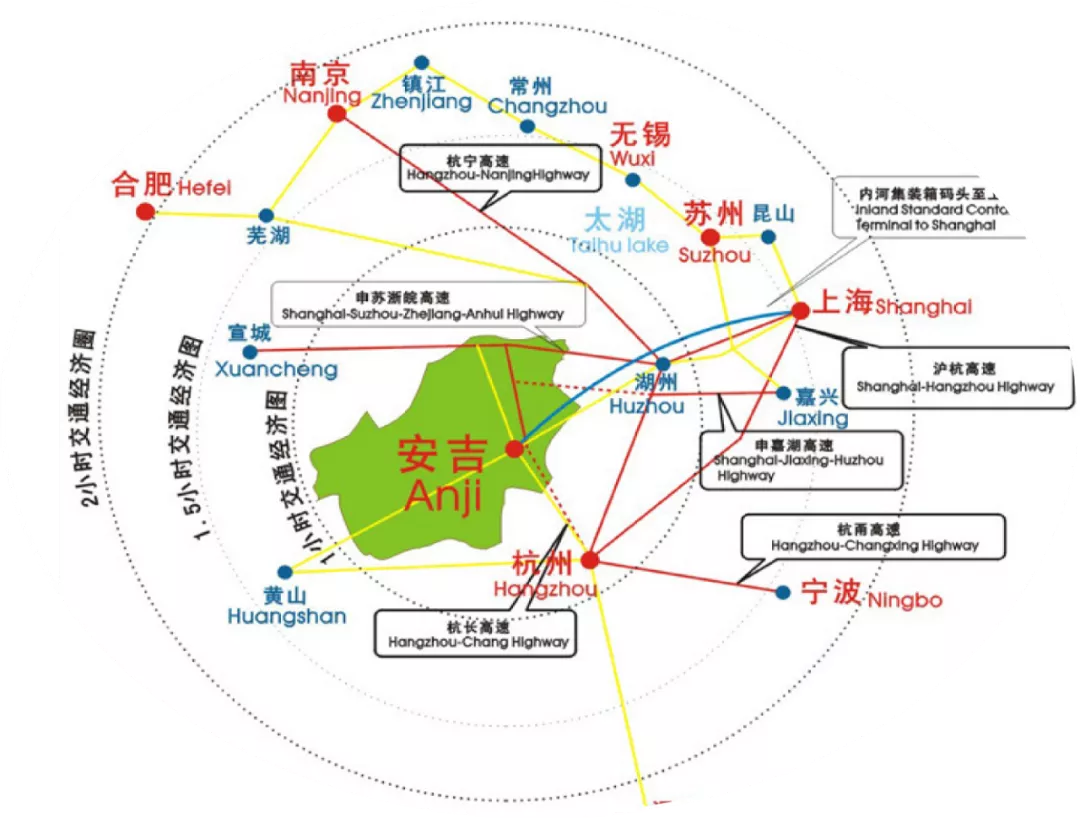 安吉全县现拥有高铁1条、高速公路2条、通用航空机场1座,随着综合交通网络的不断健全,安吉速度将实现30分钟到杭州、湖州,90分钟到上海、苏州、南京、合肥的快捷出行!