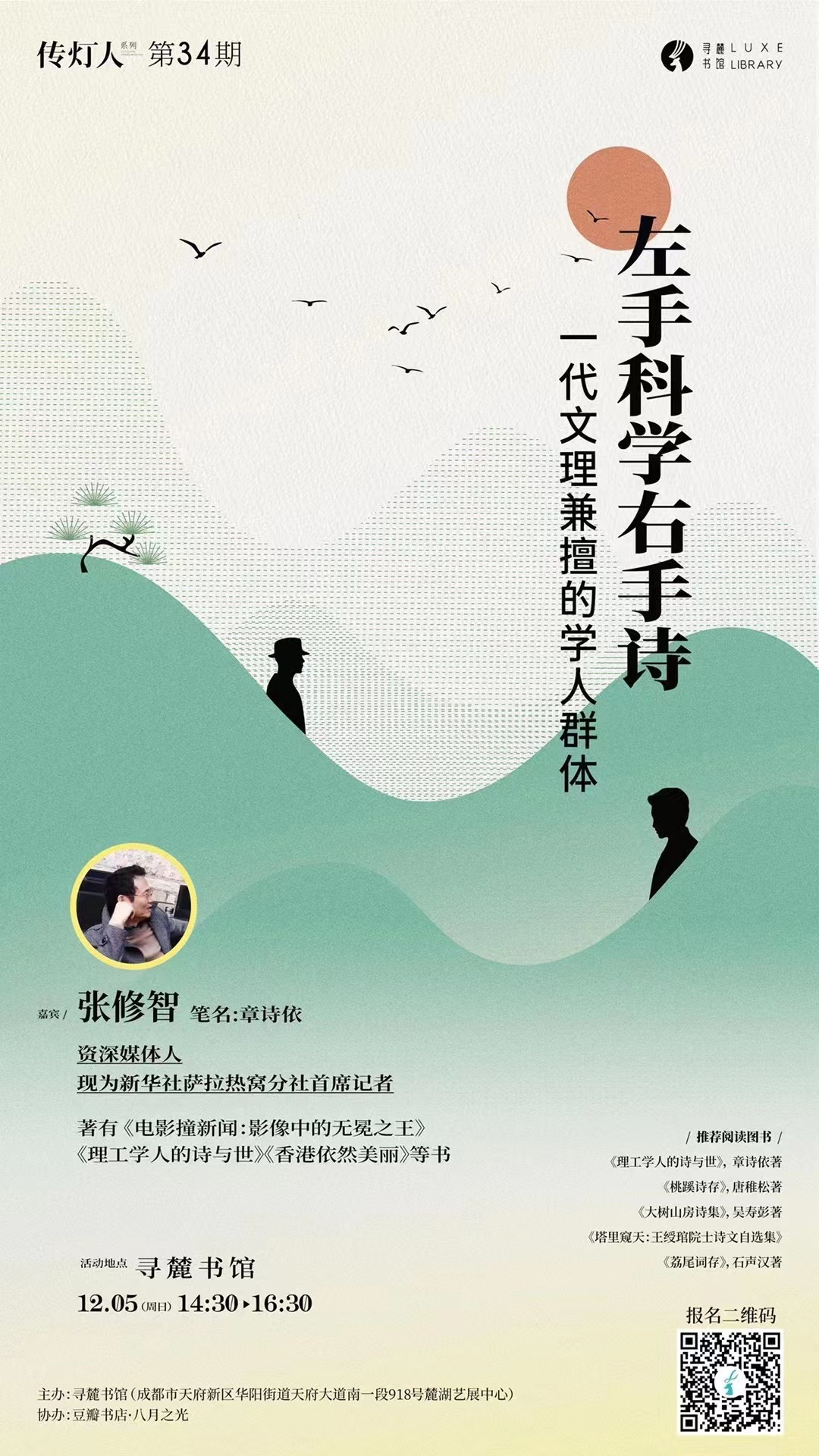 诗人从来都不是一种职业,文理兼修又何尝不可。12月5日的传灯人系列活动,资深媒体人、新华社萨拉热窝分社首席记者张修智与你分享一代文理兼擅的学人群体的才情与故事。
